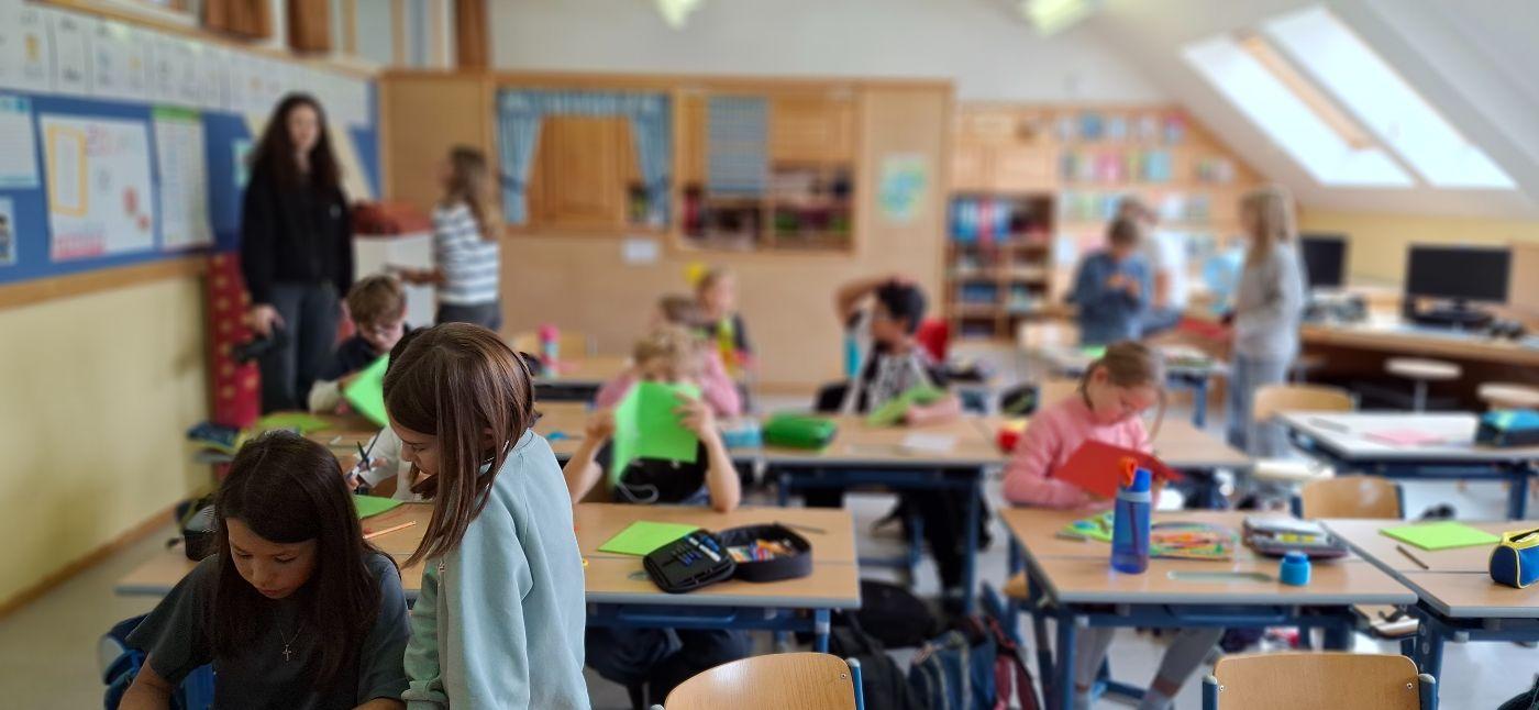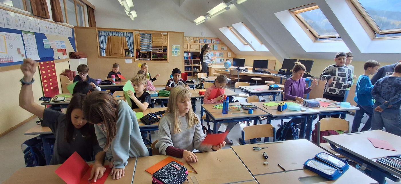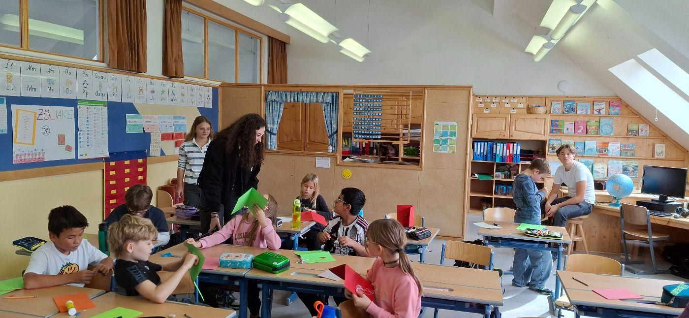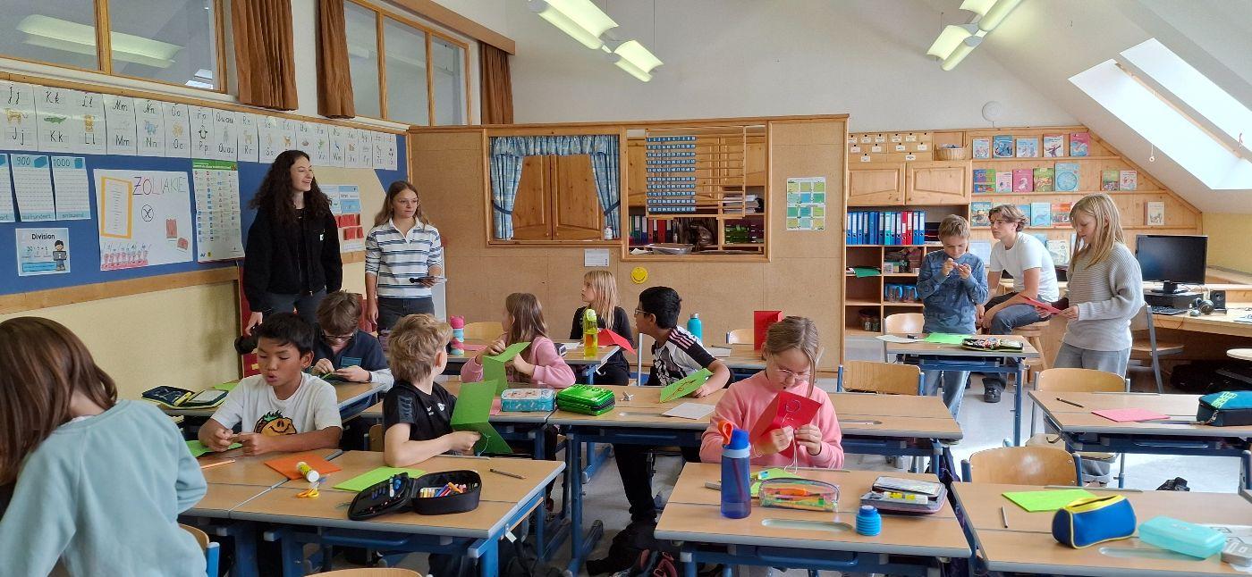 Der Grund ist ihre Diplomarbeit mit dem Thema "Der digitale Adventskalender: 24 Videos im Advent". Die HAK-SchülerInnen machen es sich zur Aufgabe, unter anderem Interviews und Videos in verschiedenen Einrichtungen des Bezirkes Landeck zu besuchen, um zu erfahren, wie dort Weihnachten erlebt und gefeiert wird. Bei uns in der 4b Klasse durften sie im Fach "Technik und Design" dabei sein um zu sehen, wie wir unter anderem Weihnachtskarten gestalten, um diese dann an unsere Lieben zu verschenken. Weiters führten sie Interviews mit einigen von uns Schülern durch, um besser zu verstehen, was Kinder im Volksschulalter an Weihnachten besonders gefällt und wie es von ihnen gefeiert und wahrgenommen wird.