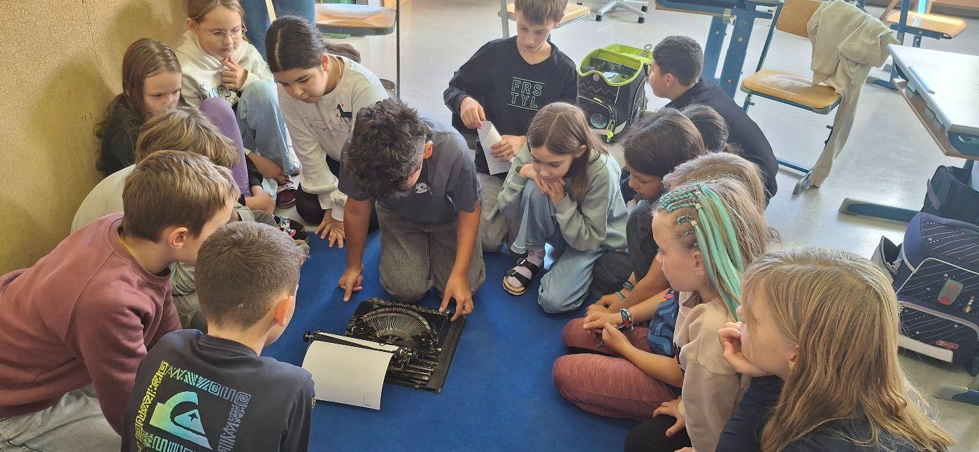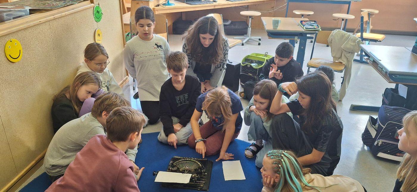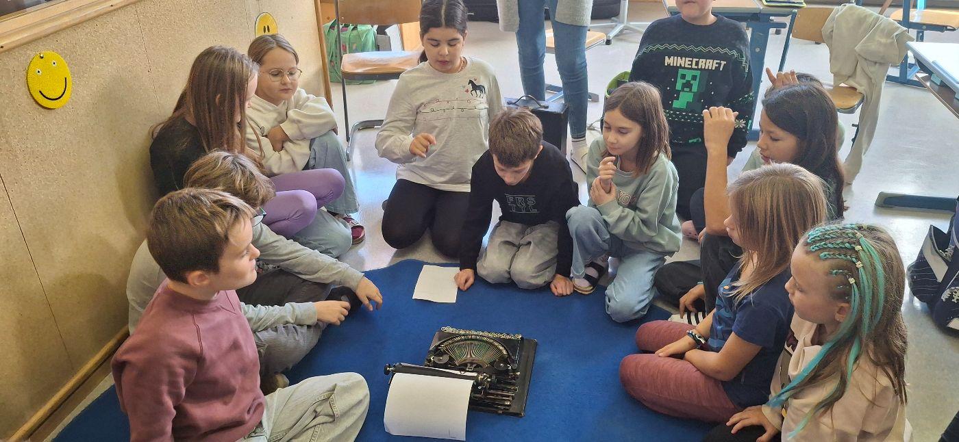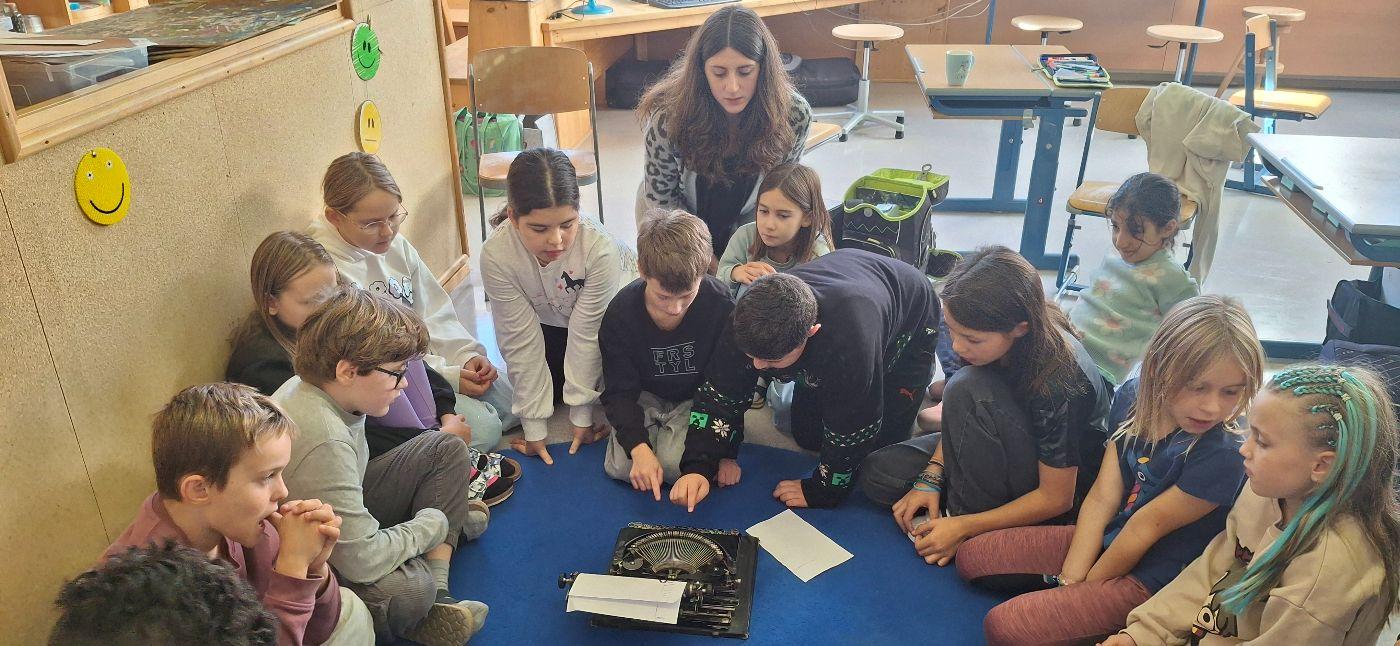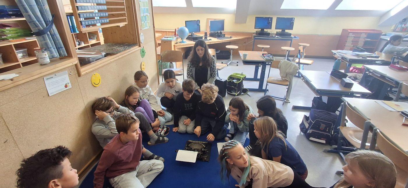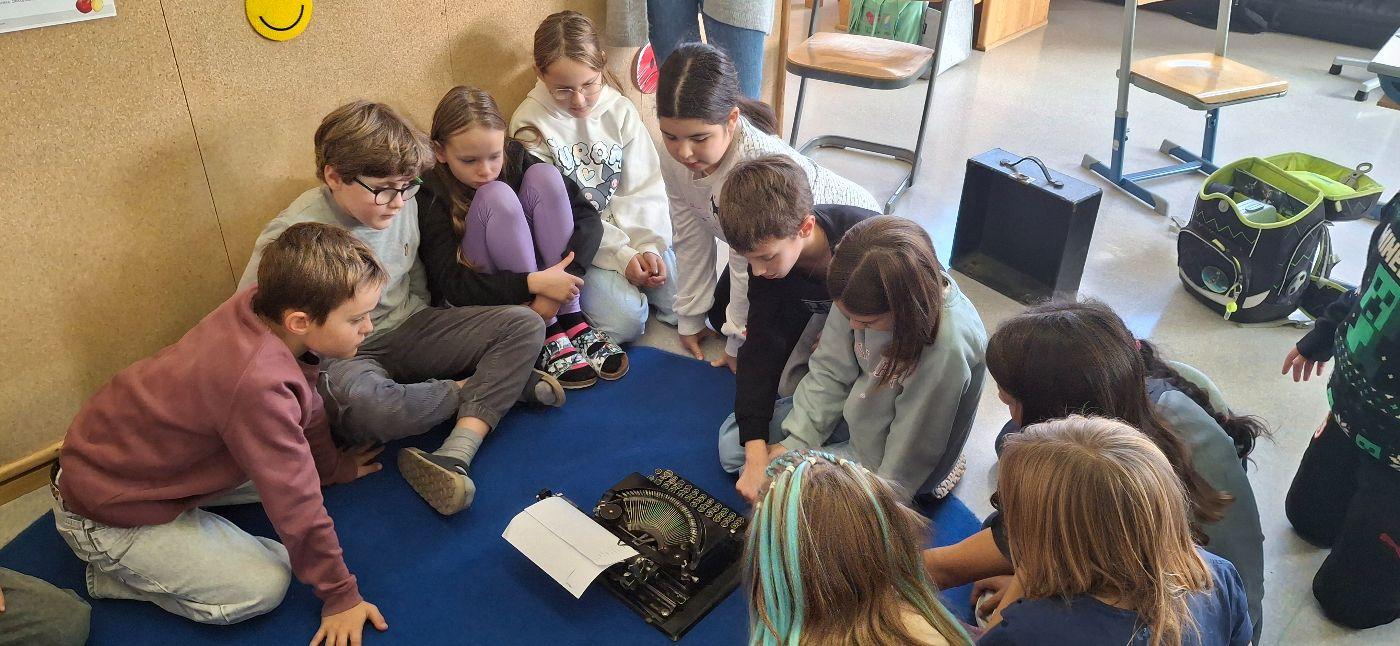 Tobias brachte uns nämlich eine sehr alte Schreibmaschine, die circa 80 Jahre alt ist. Er erzählte uns, wie es dazu kam...Seine Urgroßeltern vermieteten zur damaligen Zeit Zimmer. Dort wohnten Menschen, denen diese Schreibmaschine gehörte. Diese verwahrten sie in einem Schrank. Aber als sie nach dem Krieg dort weggingen, mussten sie ihr ganzes Hab und Gut tragen. Da diese Maschine viel zu schwer war, mussten sie sie zurücklassen. Erst als die Gäste abgereist sind, fand Tobias Urgroßvater die Schreibmaschine im Schrank. Er hielt sie in Ehren und gab sie an die nächste Generation weiter. So schenkten die Großeltern diesen Schatz an Tobias weiter. Darauf ist er wahnsinnig stolz und er hat sie heuer auch schon ausprobiert. In zwei Tagen mühevoller Arbeit schrieb er eine Personenbeschreibung auf ihr. Wie herausfordernd das ist, durften seine Mitschüler ausprobieren. Jeder durfte seinen Namen eintippen und das fanden alle sehr aufregend, da sie noch nie auf einem so alten Gerät geschrieben haben. Mit der neuen Technologie heute nicht vergleichbar, aber wahnsinnig interessant! Vielen Dank an Tobias, dass du uns deinen "Schatz" mitgebracht hast und wir ihn ausprobieren durften!