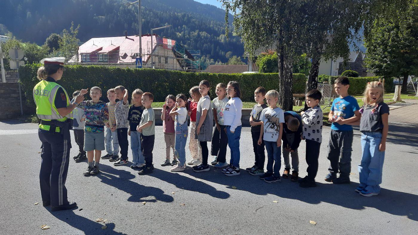 Nachdem wir zuerst in der Klasse die wichtigsten Verhaltensweisen beim Überqueren der Straße und dem richtigen Verhalten am Gehsteig wiederholt hatten, mussten die Kinder zeigen, wie es richtig geht.
