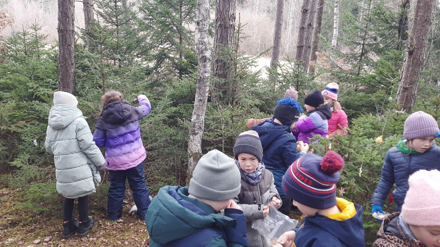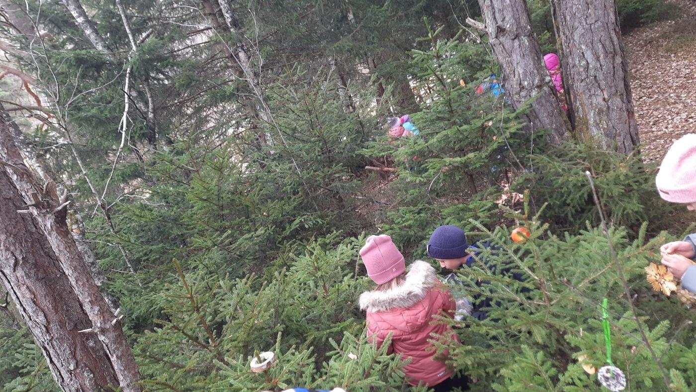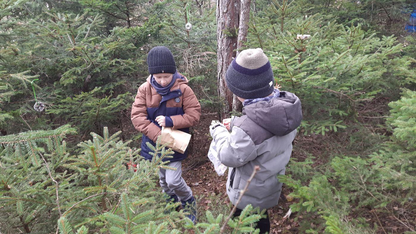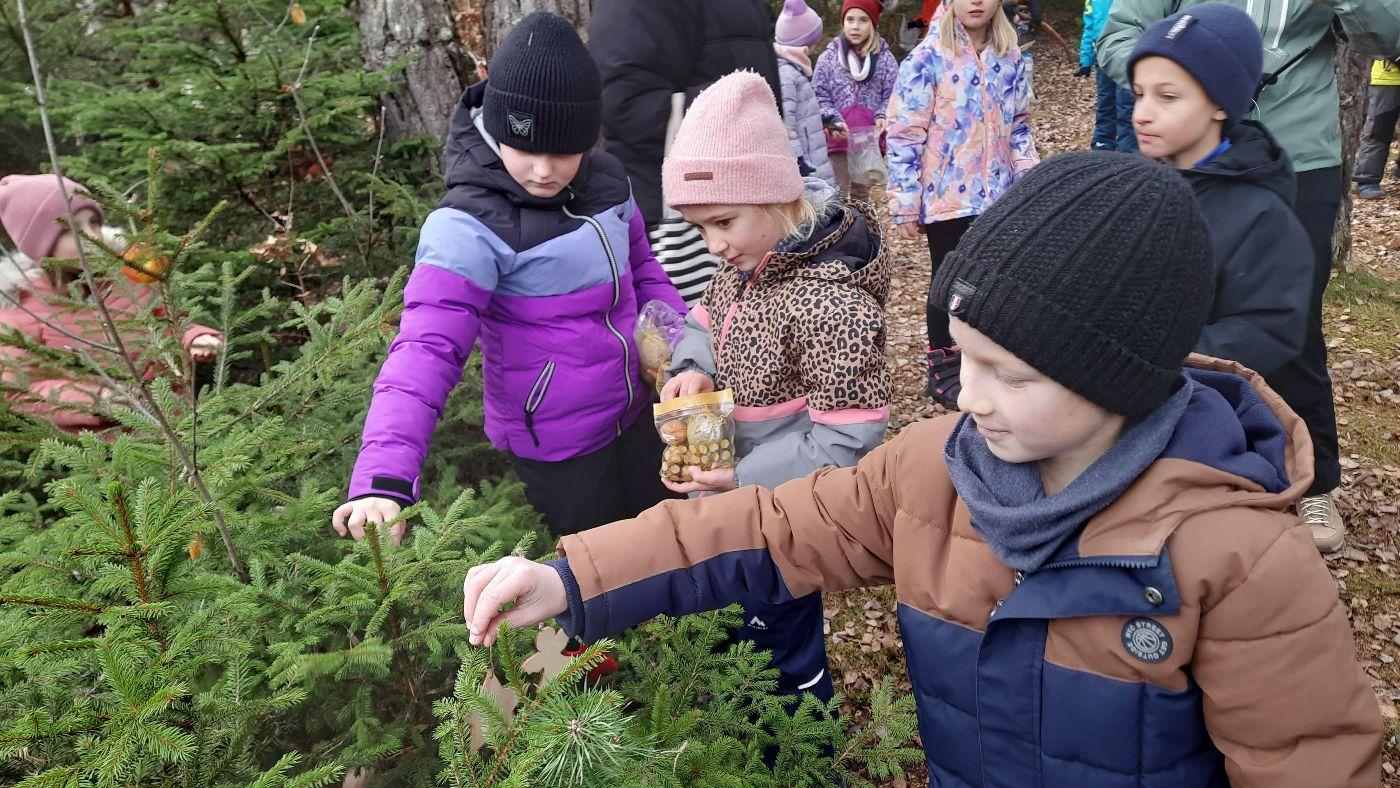 Die Kinder schmückten die Bäume liebevoll mit mitgebrachtem - teils selbstgebasteltem Weihnachtsschmuck aus Naturmaterialien. Auch für die Waldbewohner hatten viele Kinder Köstlichkeiten dabei.